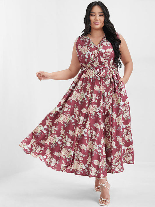 Floral Pocket Belted V Neck Flutter Maxi Dress