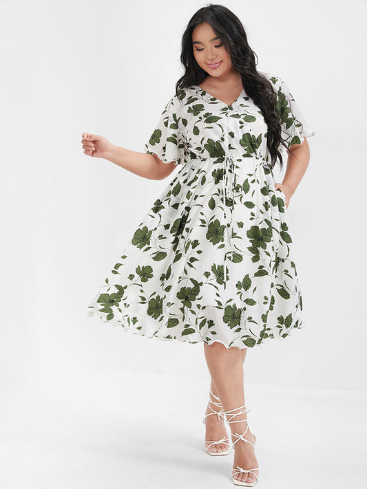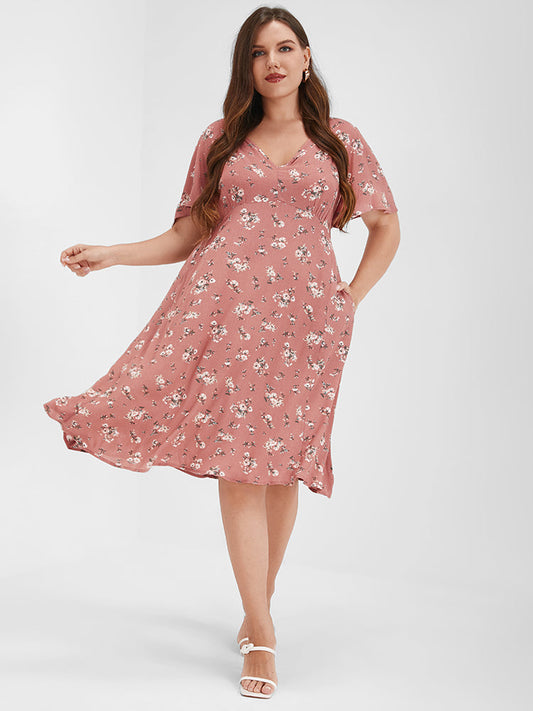 Floral Printed Ruffles Pocket V Neck Knee Dress