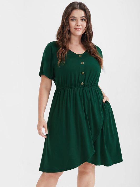 Solid Ruffles Pocket Button Wrap Hem Knee Dress