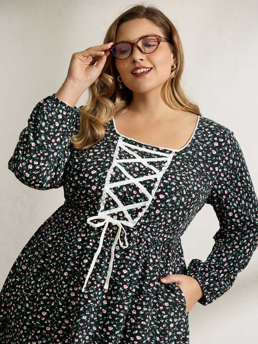 Floral Plaid Print Puffy Sleeve Midi Dress