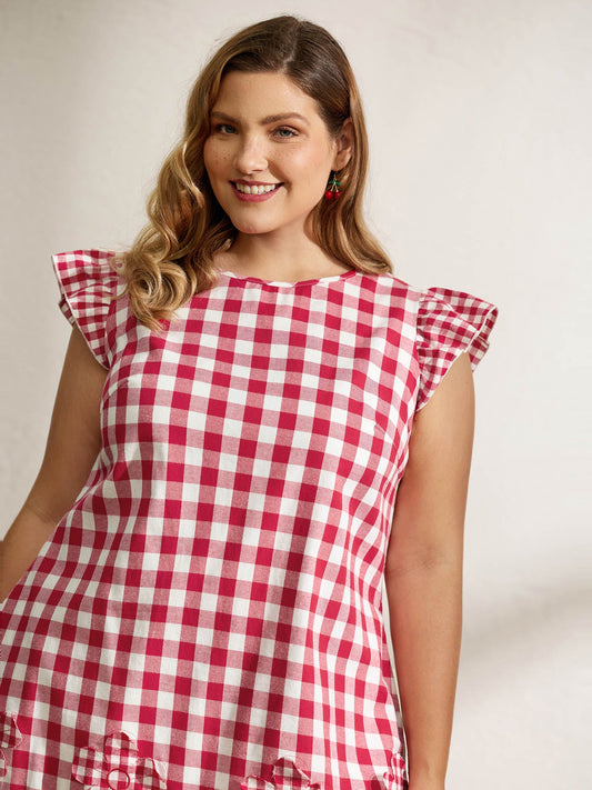 Cotton Gingham Embroidered Ruffled Hem Knee Dress