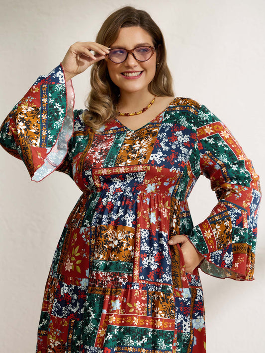 Abstract Print Neck-Tie Pockets Maxi Dress