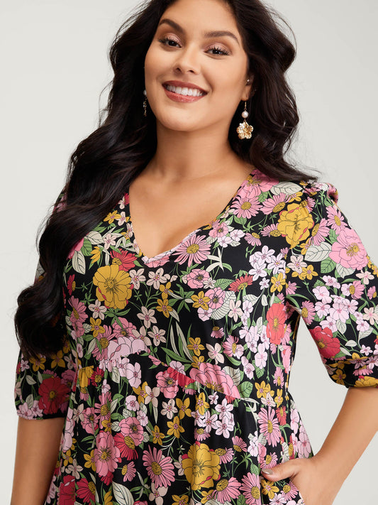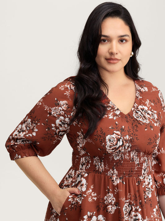 Floral Print Shirred Bust-Comfort Maxi Dress