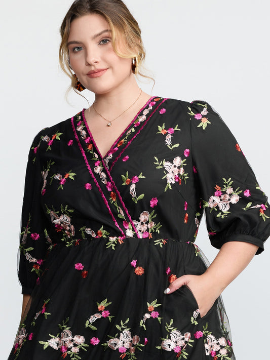 Floral Embroidered V-Neck Pockets Midi Dress