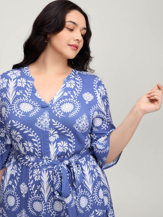 Boho Print Belted Side Pockets Midi Dress