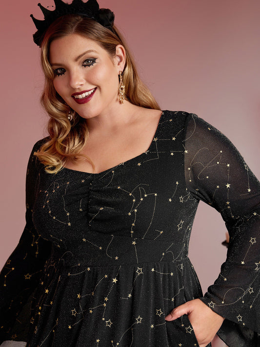 Starry Silk Mesh Flared Sleeve Midi Dress