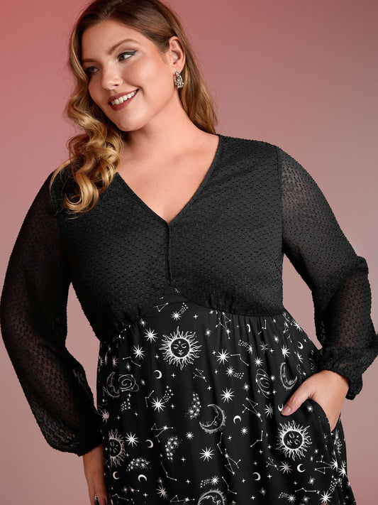 Chiffon Gold Celestial Print Tiered Midi Dress