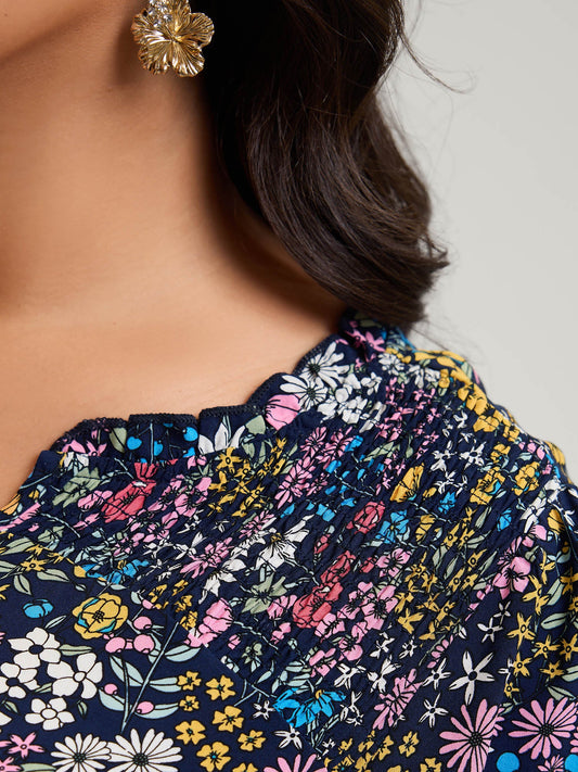 Sheer Floral Embroidered Scalloped Neck Midi Dress