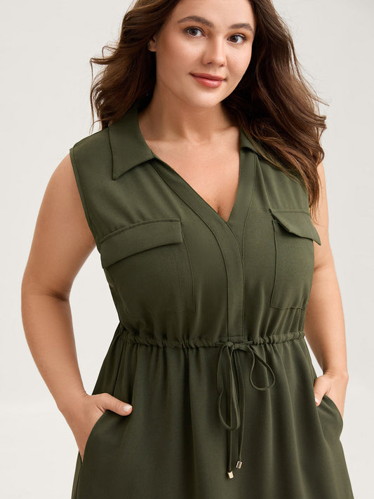 Waist Drawstring Pockets Solid Midi Dress