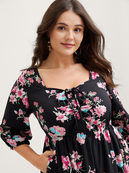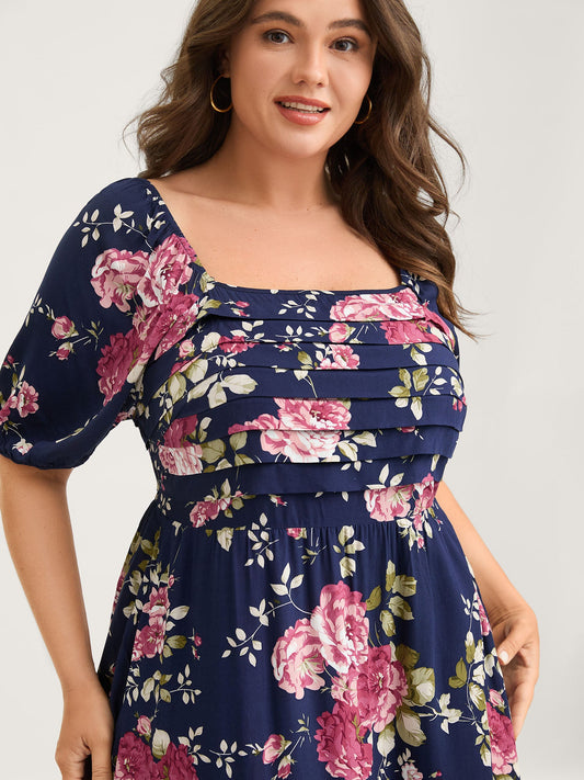 Rayon Floral Shirred Stretchy Waist Midi Dress