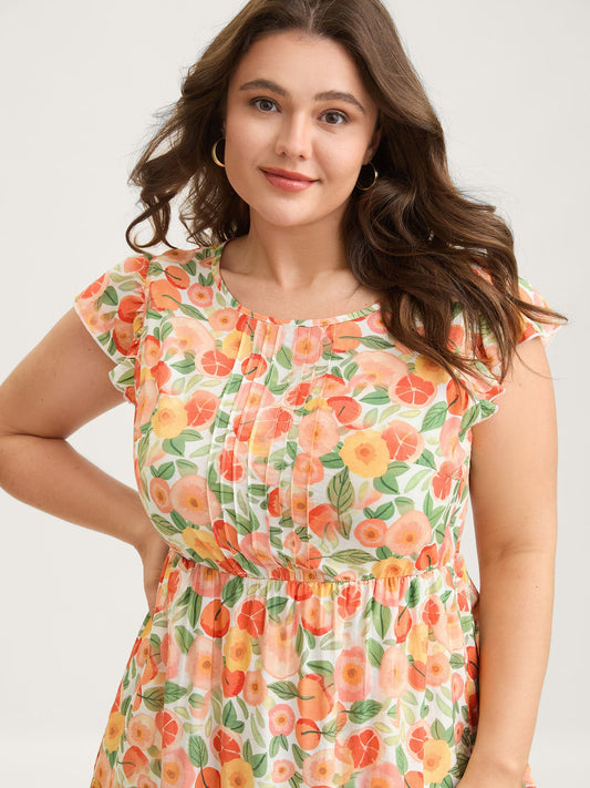 Citrus Print Pleated Flutter Sleeve Midi Dress