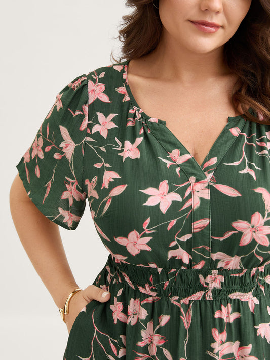 Rayon Silhouette Flower Side-Tie Midi Dress