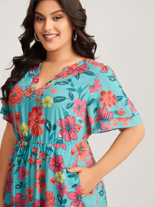 Rayon Floral Hem Cinched-Waist Midi Dress