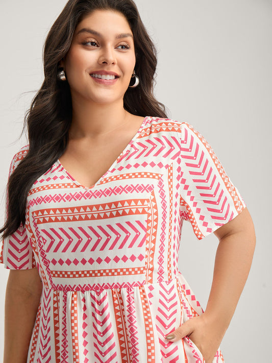 Geometric Stripes V-Neck Midi Dress