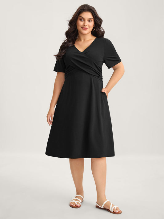 Overlap Bodice Solid Knit Pockets Midi Dress