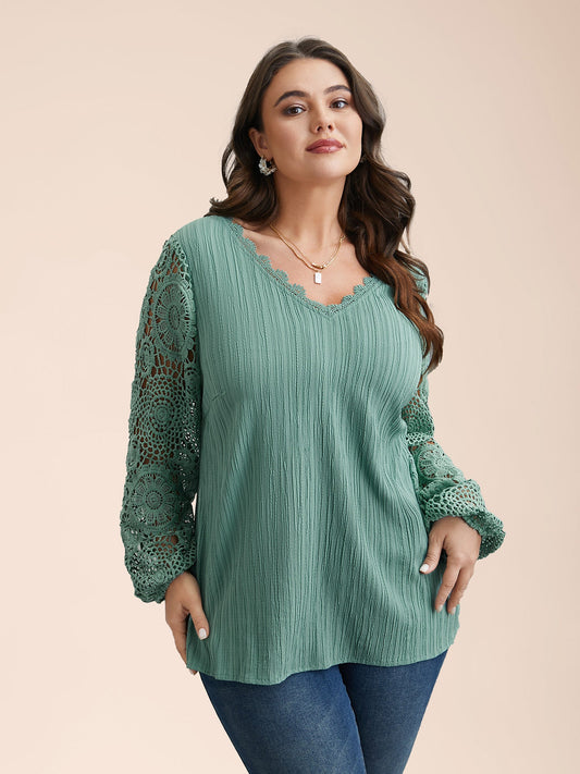 Scalloped Lace Textured Sheer Sleeve Blouse