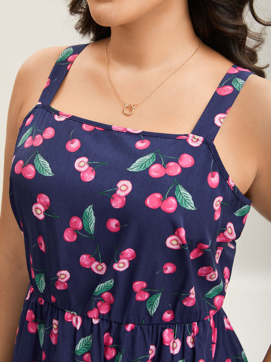 Cherry Print Stretchy Waist Pockets Midi Dress