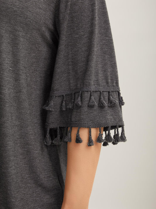 Tassel Sleeve V-Neck Plain T-Shirt