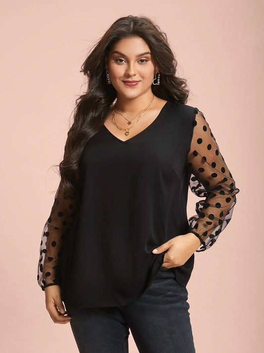 Polka Dot Sheer Mesh Sleeve Spliced Blouse