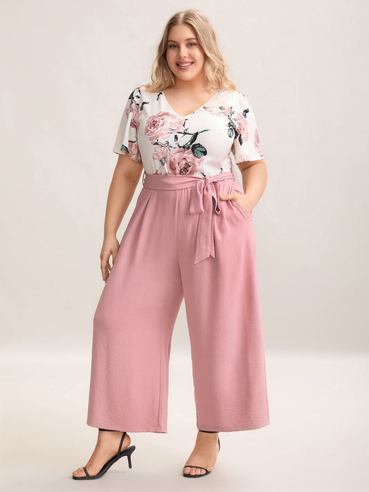 Floral Print Belted Pockets Spliced Jumpsuit