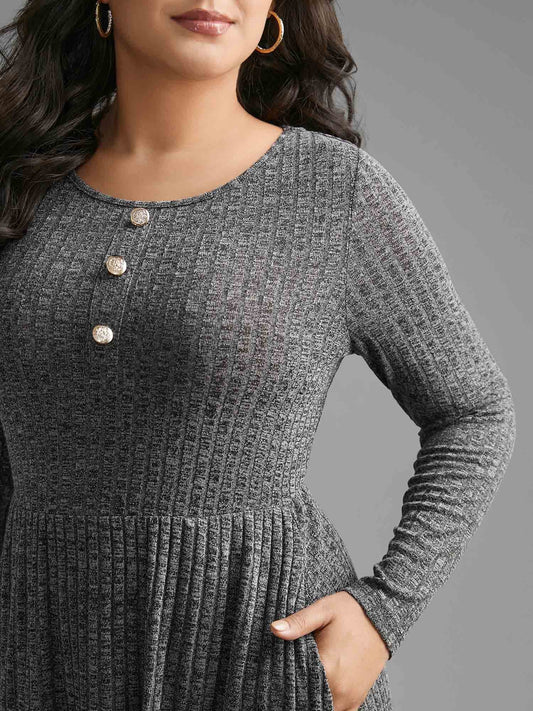 Crew Neck Rib Knit Button Detail Dress