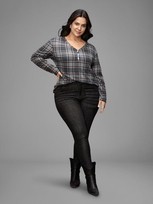 Plaid V-neck Full Sleeves Slim-Fit Tee