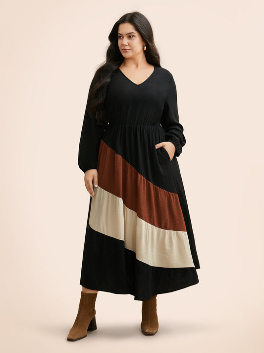 Colorblock Contrast Gathered Lantern Sleeve Dress