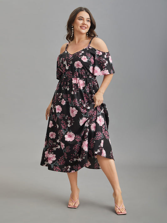 Floral Print Cold-Shoulder Pockets Midi Dress