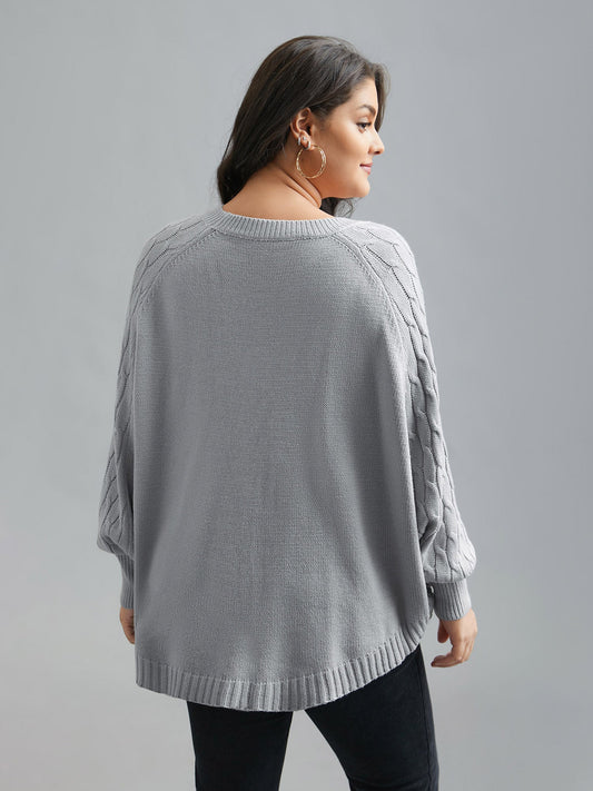 Cable Knit Dolman Sleeve Curved Hem Pullover