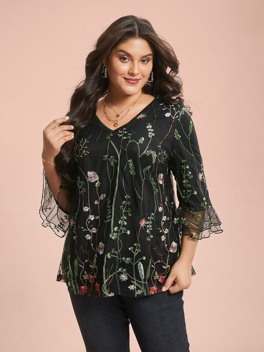 Embroidered Mesh Lotus Leaf Sleeve Blouse
