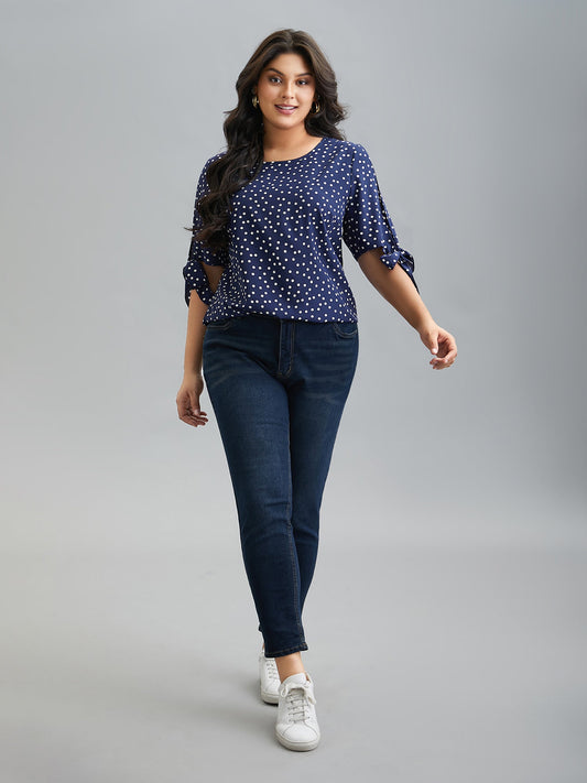 Polka Dots Round Neck Sleeve-Tie Blouse
