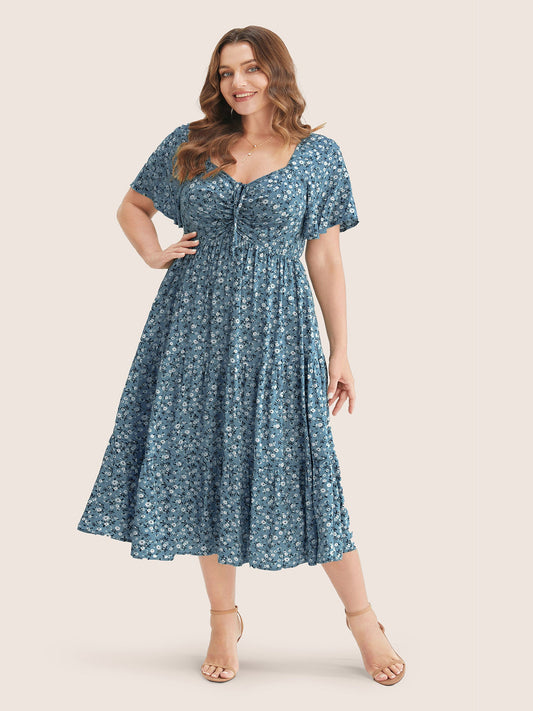 Ditsy Floral Drawstring Ruched Pocket Ruffle Tiered Dress