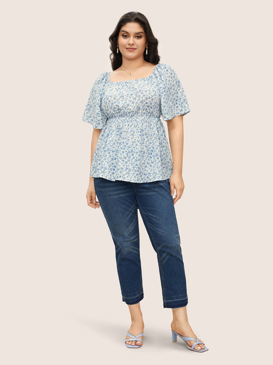 Ditsy Floral Ruffle Sleeve Shirred Square Neck Blouse