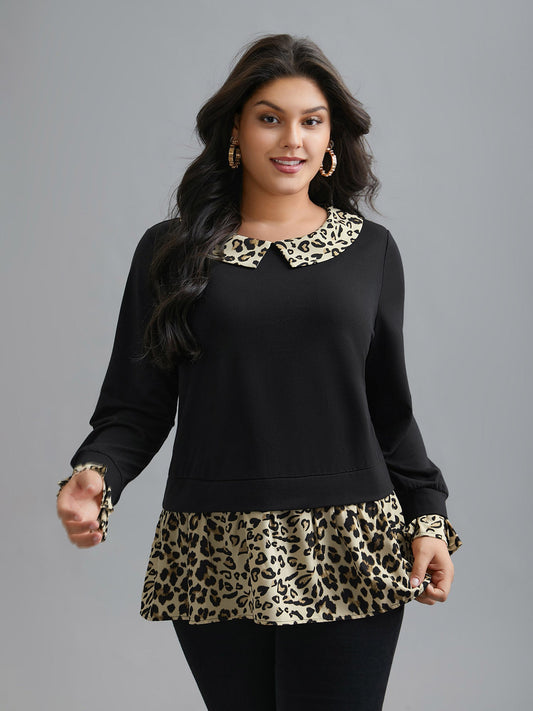 Peter Pan Collar Leopard Print Patchwork Sweatshirt