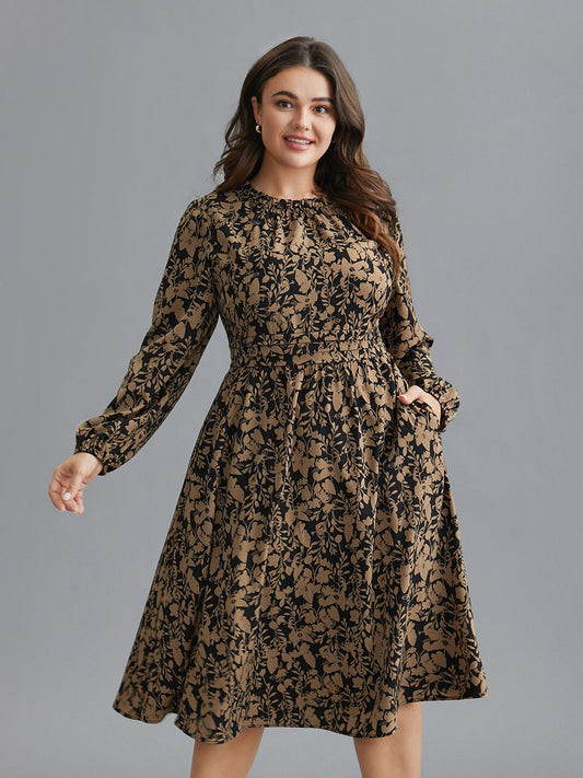 Floral Mock Neck Ruffles Pleated Waist Dress