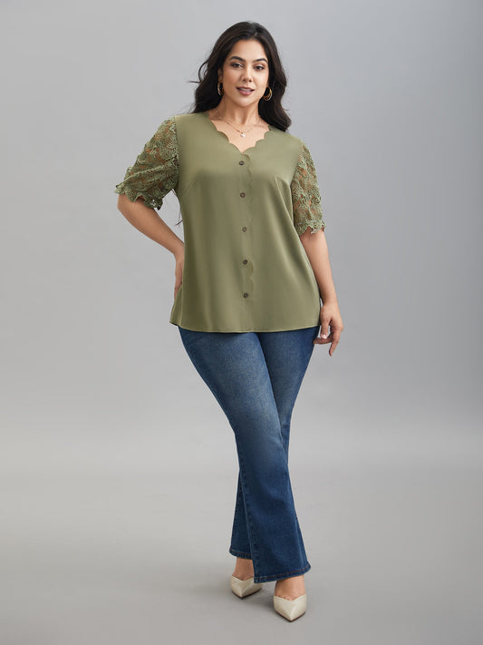 Lace Patchwork Scalloped Neck Front-Placket Blouse