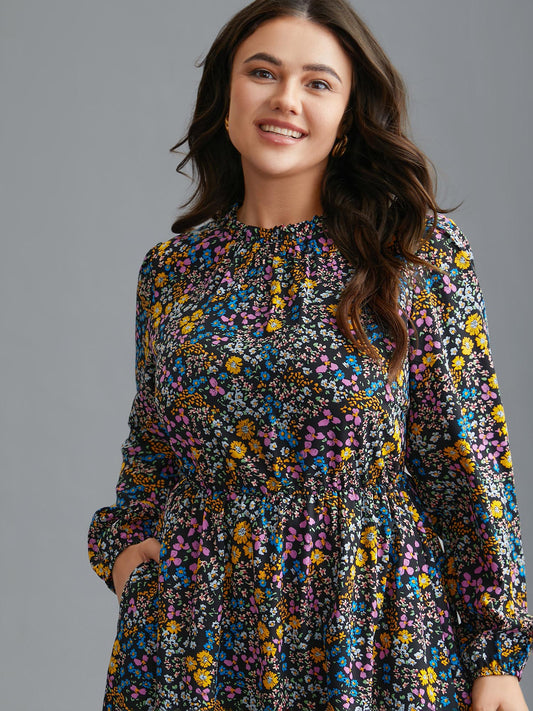 Floral Ruffles Mock Neck Elastic Waist Midi Dress