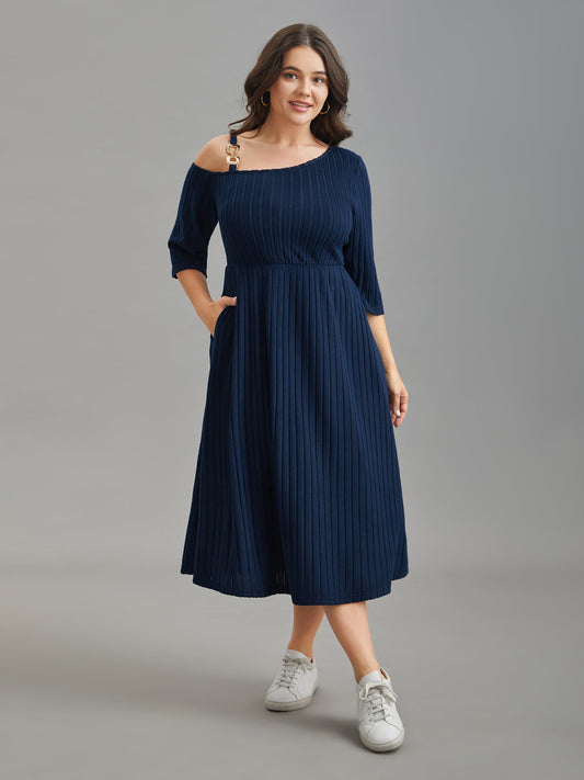 One-Shoulder Pit-Strip Knit Buckle Midi Dress