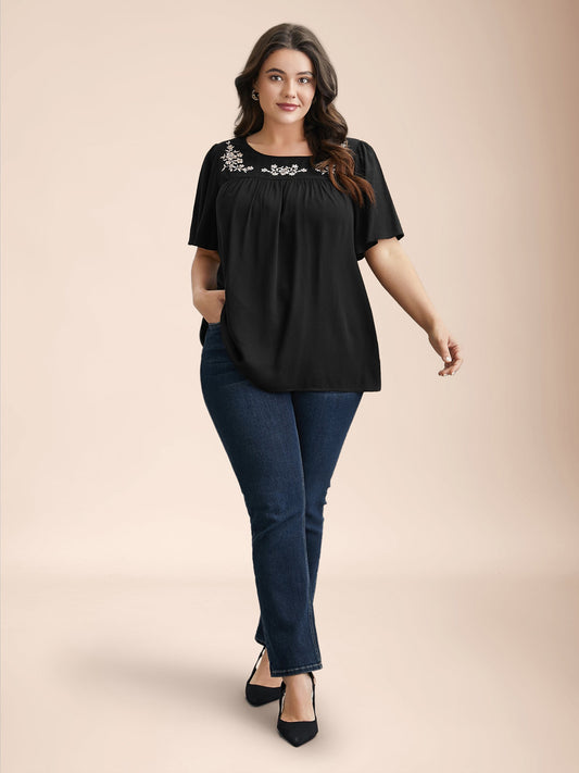 Floral Embroidery Pleated Front Blouse