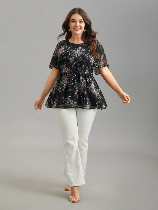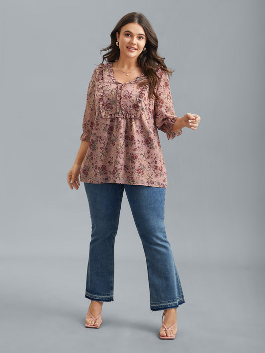 Chiffon Floral Print Ruffled Neck Flowy Shirt