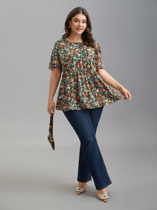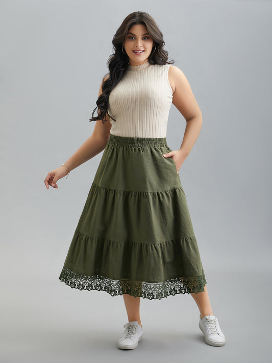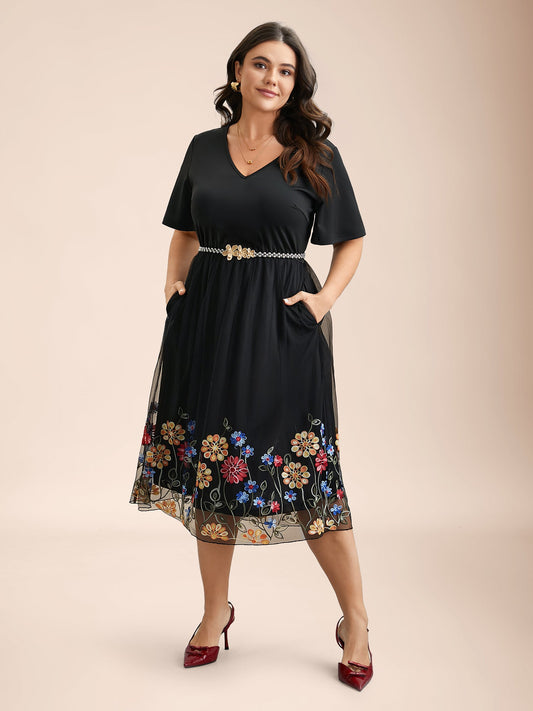 Floral Embroidered Hem Stretchy-Waist Pockets Midi Dress