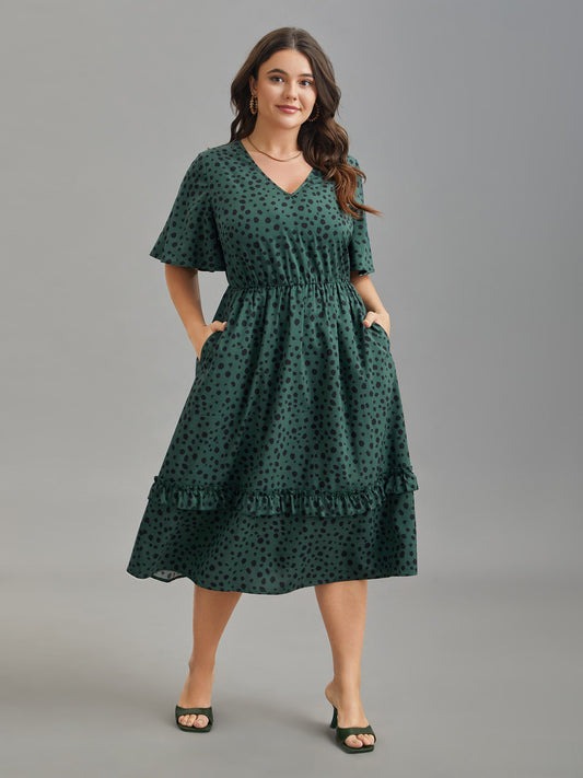 Polka Dots Surplice Neck Waist-Cinched Dress