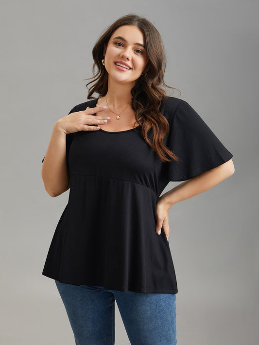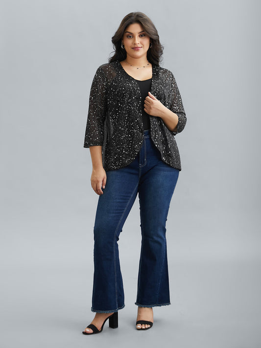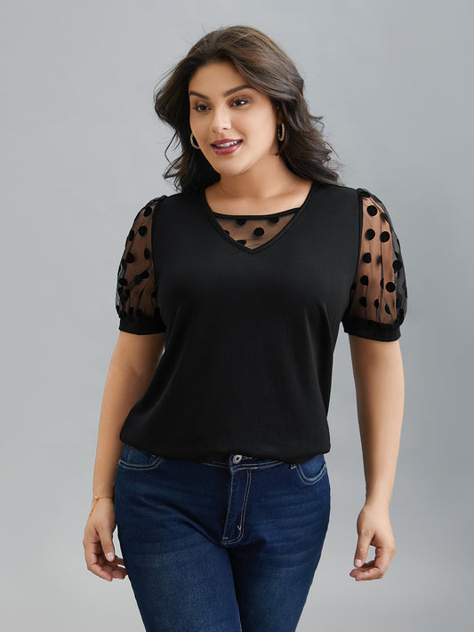 Sheer Sleeves Textured Polka Dots Stretchy Top