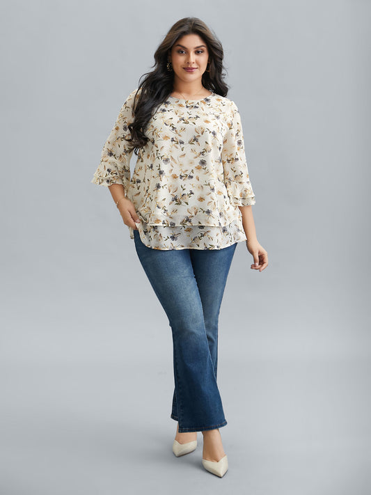 Floral Spliced Heart Neckline Gathered T-Shirt