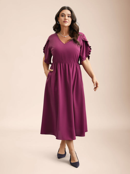 Petal Sleeve Ruffled Waist-Cinched Midi Dress