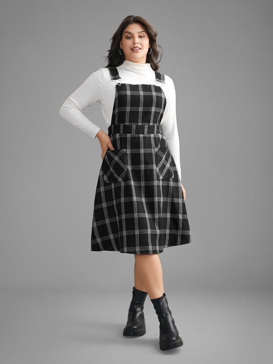 Plaid Square Neck Patched Pocket Dress