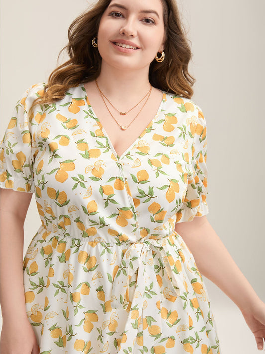 Lemon Print Surplice Stretchy Waist Midi Dress