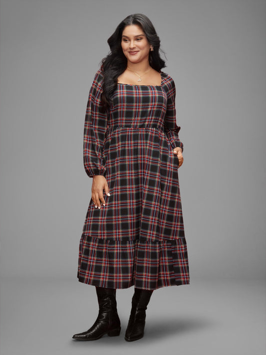Plaid Square Neckline Puffy Sleeve Midi Dress
