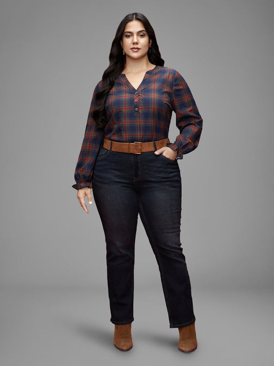 Plaid Pattern Notched Collar Slim-Fit Blouse