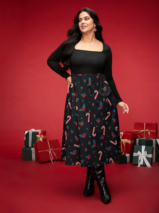 Festive Knit Printed Skirt Midi Dress